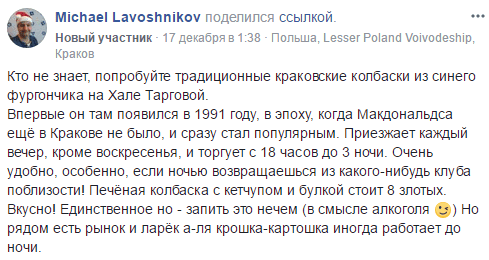 И стоит он здесь не просто так – это самая старая точка по продаже краковских жареных колбасок на улице. Первый краковский мобильный фаст-фуд появился еще во времена, когда Лех Валенса был президентом. Тогда у него не было конкуренции – в центре Кракова нельзя было найти работающей точки по продаже еды после 10 вечера, в те времена не было МакДональдса, он появился через год и уже в Варшаве.