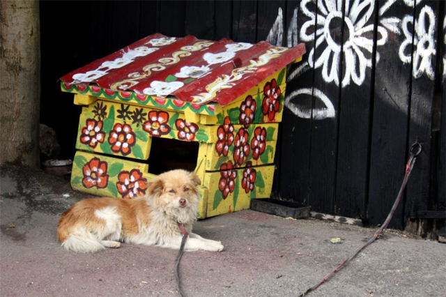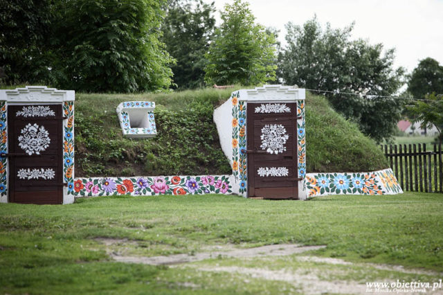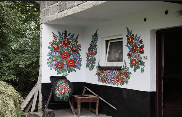 Здесь украсили цветочными орнаментами дома, коровники, конюшни, заборы, колодцы, подвалы и даже… собачьи будки. По мнению этнографов, обычай украшать стены цветочными мотивами, вырос из обычая красить стены хижин весной после осенних ливней и зимних метелей, а также чтобы закрасить пятна от сажи. Этот обычай также бытовал прошлом в других странах региона, например, в Словакии или Венгрии, но практически исчез там.