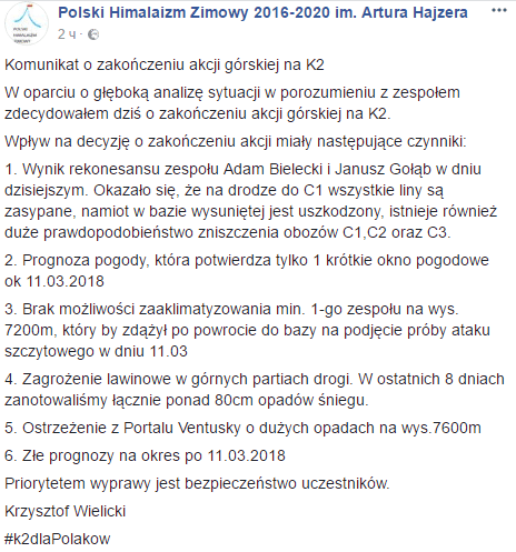 Руководитель экспедиции Кшиштоф Велицкий написал в Facebook, что команда оставила попытки штурмовать K2. Он подчеркнул, что приоритетом экспедиции является безопасность её участников, на что он обратил внимание всех альпинистов и организаторов с самого начала, как только началась подготовка к восхождению.