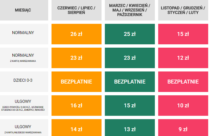 Цена билетов колеблется от 26 до 15 злотых в зависимости от сезона, наличии карты варшавянина, возраста.