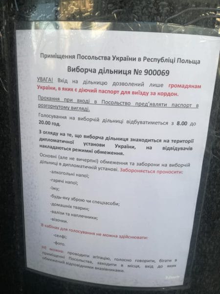 Напомним, избирательный участок в Варшаве  отрылся в 8 утра и будет работать до 20.00. В бюллетенях – два кандидата: действующий президент Петр Порошенко и шоумен, основатель Студии Квартал 95 Владимир Зеленский.